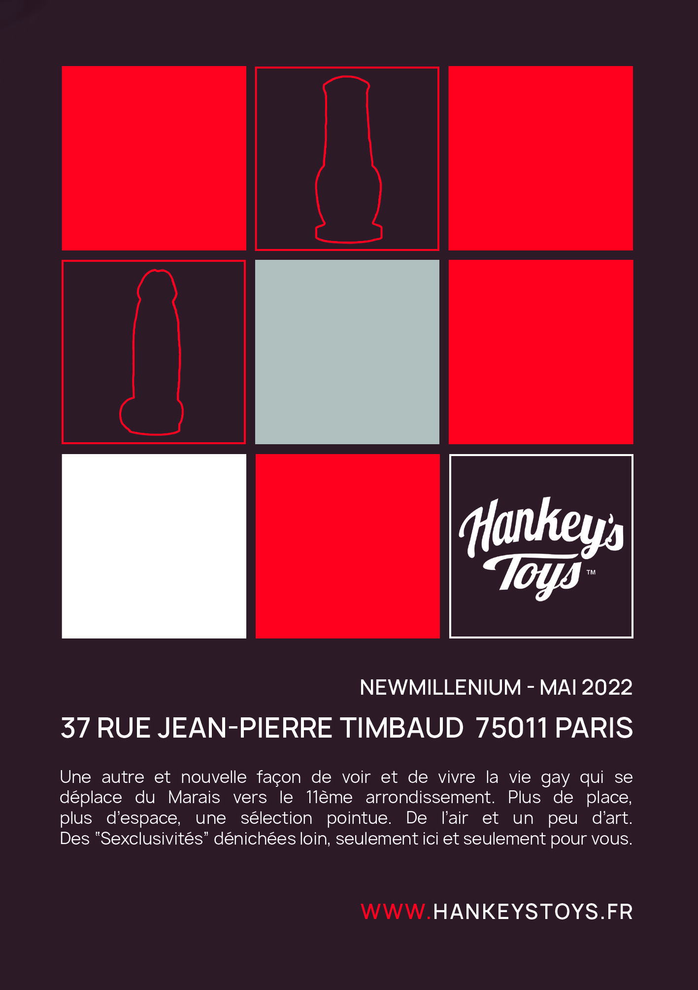 À tous ceux qui l’ignorait encore, à la mi-mai New Millenium renait de ses cendres encore chaudes devenant la première vitrine sur le continent Européen de Mr Hankey’s Toys à San Diego. Artisans-fabriquants, ils sont 5 à réaliser chaque modèle à la main, beaucoup s’en vantent, eux le font. Et il ne s’agit pas ici de « Finition à la main », les amateurs de salon de massage comprendrons. Présentés comme les plus réalistes ou Fantasy du marché chacun (et chacune) trouvera son jouet aux proportions de ses fantasmes. Les 55m2 du sexshop du 37 rue Jean-Pierre Timbaud se transforment en un écrin mêlant élégance, luxe et volupté pour une expérience hors du commun au milieu de ces godes et plugs de haute facture. Du format original pour les orifices les plus délicats aux versions XXXL pour les plus gourmands, Venez prendre le temps de choisir et de découvrir parmi plus de 170 modèles et tailles différents pour la première fois en un seul lieu.  Nouveaux venus ce mois-ci : Clip-Clop et Axel, le Minautor ou le Scimitar. Sans oublier le préféré et indépassable « The Lover » énorme et appétissant sexe aux proportions parfaites qui pourrait être celui du « David de Michel-Ange » Quel sera le vôtre ?