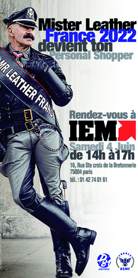 A l'occasion de Paris Fetish, Eric Mister Leather France 2022, sera à la boutique IEM le samedi 4 juin pour t'accompagner et te conseiller dans tes achats de 14h à 17h. Profitez-en pour échanger sur son expérience d'ambassadeur du milieu cuir et les bons plans pour un dresscode parfait.