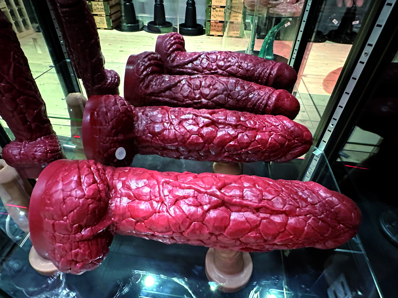 Mais, nous a-t-on dit lors de notre visite, la marque est surtout connue pour l’exacte reproduction de sexes en fonction des ethnies : caucasiens, noirs, hommes originaire d’Amérique latine, asiatiques, … tout le monde n’a pas un sexe de la même forme, à commencer par le gland, avec ou sans prépuce, le diamètre ou la longueur (bien que Dame Nature s’attache à ce que la diversité soit la plus large possible pour casser les codes et les préjugés). Vous n’aurez que l’embarras du choix !