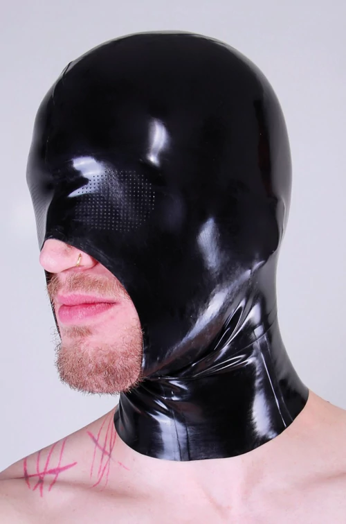 Cette cagoule a deux grandes caractéristiques : 1) Un nez, une bouche et un menton ouverts. Cela permet un accès plus facile à la bouche et une respiration optimale par le nez pendant que votre bouche est… occupée.  2) Trous micro-perforés sur les yeux. Les petits trous au-dessus des yeux créent une surface semblable à un écran à travers laquelle vous pouvez voir avec une visibilité incroyable. Mais comme les trous sont si petits, la capuche apparaît comme s'il n'y avait pas de trous pour les yeux. Cela offre également un meilleur anonymat. Tout voir sans être vu !  Comme toutes nos cagoules, cette cagoule est découpée et collée, non moulée, ce qui signifie que le latex est de meilleure qualité et conserve son éclat plus longtemps. Consultez le tableau des tailles pour vous assurer de choisir la bonne taille pour votre tête et votre cou. 99,90€