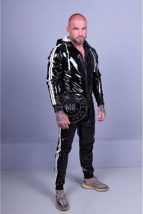 Déjà un classique ! LE survêtement en PVC  déjà apprécié par beaucoup d'entre vous ! C'est noir, brillant et ça crépite ! Le pantalon présente 2 rayures, un cordon de serrage à la taille, 2 poches latérales et un logo MR noir surpiqué sur la jambe gauche. Ces survêtements en PVC sont le nec plus ultra en matière de mix and match ! Habillez-le avec la veste assortie pour un look complet avec vos baskets préférées ou mélangez-le avec des bottes, votre t-shirt préféré et n'importe quelle veste pour un autre look classique instantané ! Le PVC est un matériau non élastique, s'il a été étiré, il ne retrouvera pas sa finition/forme d'origine. Gardez votre PVC au top avec un nettoyant PVC/vinyle brillant ! IEM, 16 rue Sainte Croix