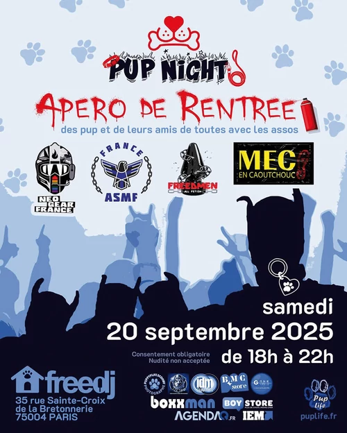 Qui dit rentrée, dit apéro. Vous savez que les puppies ne sont pas les derniers pour s’amuser. Pour la prochaine Pup Night qui ouvre une nouvelle saison de rendez-vous festifs et chaleureux, kinky et conviviaux, ils vous attendent dans leur niche habituelle, le Freedj le samedi 20 septembre dès 18h pour faire la fête avec les associations Neo Gear France, ASMF, MECS et Freedmen. Un moment de retrouvailles, d’échanges, de fiertés en perspective.